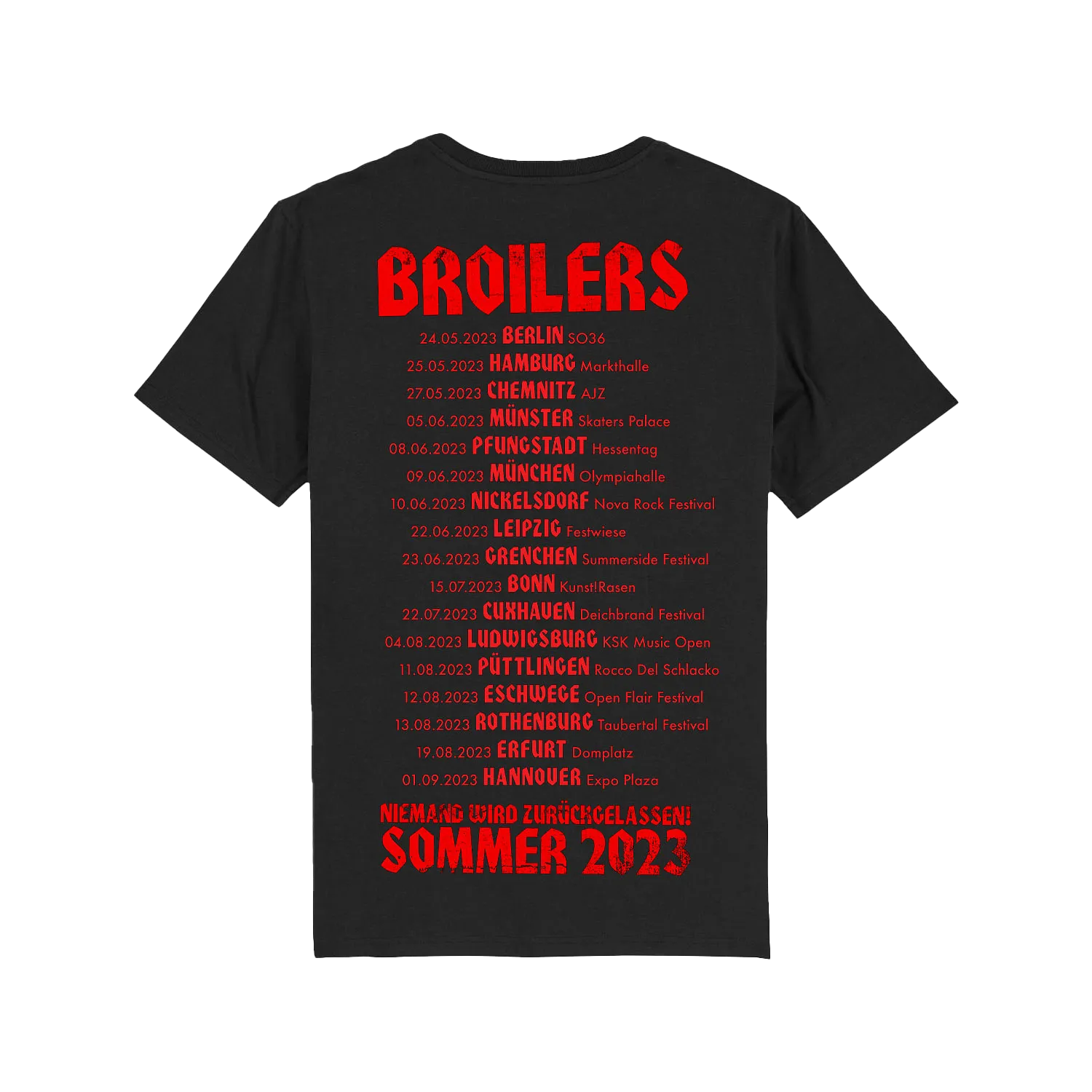 Für alle, die es nicht auf die Tour geschafft haben oder nicht am Merchandising-Stand waren: Das Shirt zu den „Niemand wird zurückgelassen“-Sommer-Open Airs. Mit allen Tourterminen auf dem Rücken.